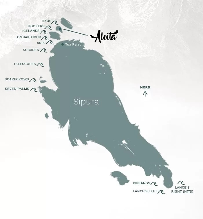 Pulau Sipora (accessible by plane from Padong and boat from Siberut) is the Menrawai Islands’ primary surfing destination. Strategically located in the Mentawai Islands, Pulau Sipora is the smallest island in this cluster off the coast of West Sumatera. Compared to the other four major islands in the Mentawai, Pulau Sipora’s position is right in the middle between Pulau Pagai and Pulau Siberut. On this island is the town of Tua Pejat, the district capital of Mentawai. Covering an area of approximately 845 square kilometers, Pulau Sipora is approximately 10-15 percent pristine rainforest. Much of the population on Sipora are either farmers or fishermen.