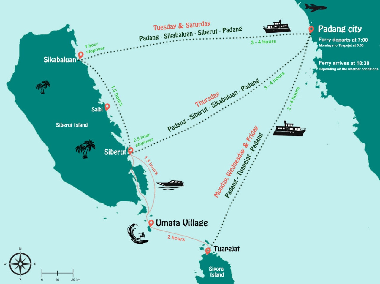 The boat from Padang to Pulau Siberut will depart on Mondays, Wednesdays and Thursdays, ticket prices being approximately Rp85.000. Departures back to Padang will be on Tuesday, Thursday, Friday and Saturday. Mentawai Express offers a journey by speed boat taking approximately 4 hours to Pulau Siberut from Padang. At a cost of approximately Rp85.000, transportation is available on Thursdays and back to Padang on Friday.