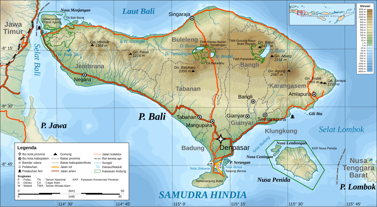 Bali is an Indonesian island located eight degrees south of the equator. The westernmost of the Lesser Sunda Islands, it is situated between Java to the west and Lombok to the east. It is an Indonesian province with the provincial capital at Denpasar towards the south of the island. Bali is a relatively small, diamond-shaped island. It covers only 5,580 square kilometers (2.155 square miles) — making it slightly larger than the state of Delaware — and measures 140 kilometers (85 miles) across from east to west, and 80 kilometers (50 miles) from north to south. No part of the island is more than 30 kilometers from the sea. The inhabited areas are mostly in the south and east. The landscape includes large volcanos and dense forests in the north and a coastal plain in the south. In between are steep ridges and ravines covered with "cascades of rice terraces" and rimmed by coconut palms, bamboo and banana trees. Most of the western part of the island is forest, where tigers used to live. Bali’s central mountains chain contains several peaks over 2000 meters and many active volcanoes. Mt. Agung volcano dominates the north part of the island. The volcanos produce nourishing volcanic soil and the mountains block clouds, bringing lots of rain.