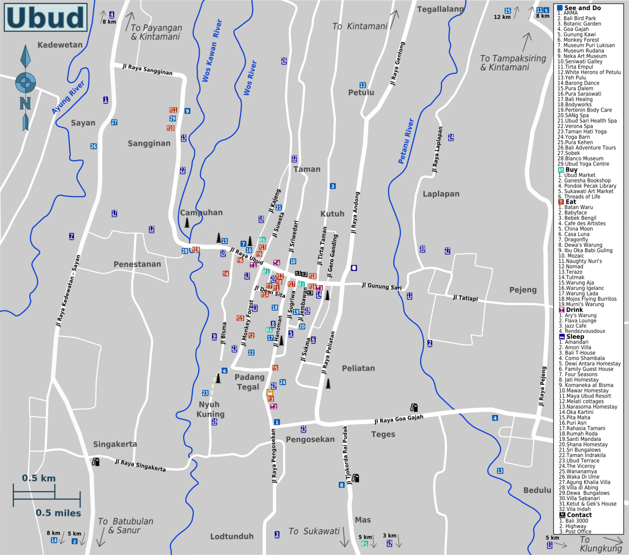 Ubud is situated on the gentle. lower slopes of Bali’s central mountains. In recent year this once small village has expanded outward and now embraces the villages that surrounded it such as Camoaun, Pemestanan, Padangtegal, and Peliatan which are now regarded as neighborhoods of Ubud. The center of town is marked by the market and bemo stand, The main thoroughfare is the Monkey Forest Road. The main east-west road is Jl Raya. Around the town are villages that specialize in certain crafts. West of Ubud is a steep downhill to the old suspension bridge (next to a newer bridge) at Camouan. Further on is Pentestanana, known for it painters. Much of the land around Ubud is owned by the family of Prince Sukawati. Hotel Tjampuhan is built on the site of Walter Spies's home. The nearby village of Pejeng is the home of Moon Temples that houses a gong said to dat back to the 3rd century B.C.