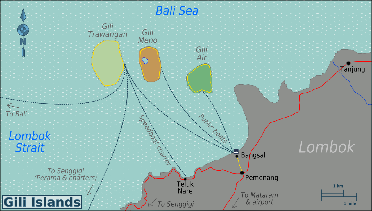 Gili Terawangan, Gili Meno and Gili Air are easily reached by speedboat from Senggigi. Speedboats with a capacity for 10 passengers can be chartered at between Rp. 800,000 to Rp. 1 million two ways. Travel time is around 20 minutes. There are also regular passenger boats from Senggigi harbour, tickets cost Rp. 10,000 per pax. The regular fast ferries from Bali direct to Gili Trawangan, departing Serangan at 8:00am and 10:00am, and daily from Padang Bai, leaving at 11.15am.