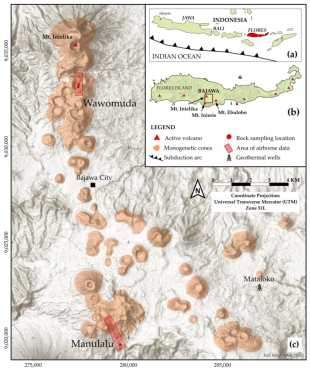 The map to the right shows the Bajawa area of central Flores Island, Indonesia, and a part of the volcanic arc of the Lesser Sunda (a,b), surrounded by active volcanoes (Mt. Inierie, Mt. Inielika, and Mt. Ebulobo in b) and monogenetic volcanoes (shaded with orange colour, (c)). The expressions of the volcanic activity on the surface indicate the presence of geothermal systems beneath the Bajawa City and Mataloko production well (c). The airborne datasets were obtained from Wawomuda and Manulalu (shaded with red in (c)) and covered the sampling locations (red dots with sample names in (c)). The hill-shaded topographic map on the background (including the modified inset map) is available from ESRI. [Source: Researchgate]