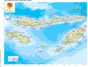 Timor (southeast of Flores) is the easternmost in Nusa Tenggara and almost the southernmost island in Indonesia. It doesn't really have that much to offer, except for the world's last remaining natural sandalwood forests, diving and some kind of interesting cultural sites. It is the most densely populated island in Nusa Tenggara, which includes Lombok and Flores. It cities are very congested and filled with traffic. Timor has direct flight to Darwin, Australia and used to be the last leg of the hippie trail from Europe to Australia. People in Timor are friendly. They love to laugh,
