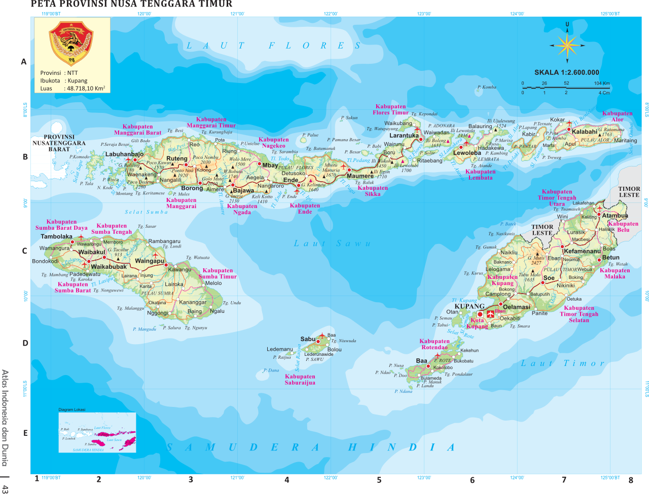 The climate of Timor is marked by an intense westerly monsoon rainy season from January to April and a long, dry season from May to December, when only modest, localized rains may occur. Large rocky hills and natural savannas characterize the landscape of West Timor. Malaria has been present on the coastsl and the soils are poor. The coordinates for the Atoni-ccupied area of Timor are 9°00' and 10°15' S and 123°30' and 124°30' E, Kupang City is the capital of the province of East Nusa Tenggara and the main city in west Timor.