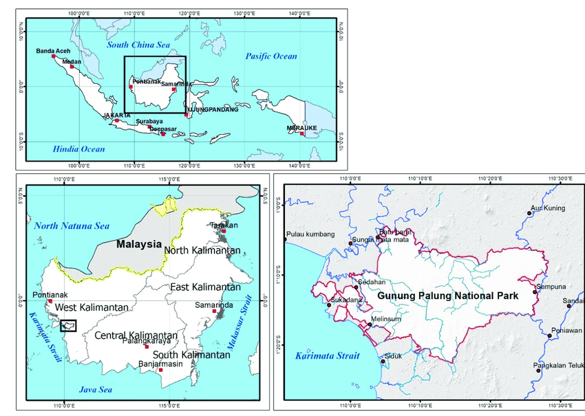 According to a report submitted to UNESCO: Physical features Betung Kerihun National Park (BKNP) located in Sub district of Embaloh Hulu, Embaloh Hilir and Putussibau, District of Kapuas Hulu, Province of West Kalimantan. BKNP covers an area of 800,000 Ha. The Park is approximately 27.60 percent of the total area of Kapuas Hulu District, around 40 percent of the total protected area in the district, or 5.5 percent of the total area of Kalimantan Barat Province (14,807,700 Ha). The topography of BKNP area ranges from lowland elevations at about 200 m asl to mountains almost 2,000 m asl high. At such the site serves as an important water catchments area. Three out of Borneo's great rivers, the Rejang and Lupar River in Sarawak, Malaysia, and the Kapuas River in Kalimantan, Indonesia, have their origins here. Meanwhile, the Park's eight types of forest ecosystems, ranging from lowland dipterocarp forest, alluvial forest, swamp forest, old secondary forest, hill dipterocarp forest, limestone forest, sub-montane forest, to montane forest, provide habitats for the valuable Bornean biodiversity. [Source: Coordinating Minister of People's Welfare, Indonesia]