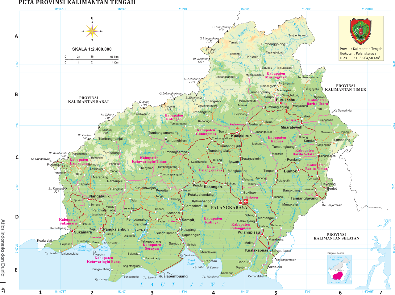 Central Kalimantan(Kalimantan Tengah) Province covers 153,564.50 square kilometers. Its population grew from 1,913,026 in 2005 to , 2,202,599 in 2010 to 2,490,178 in 2015. The population density (people per square kilometer) is 16.2. The provincial capital and largest city is Palangkaraya.