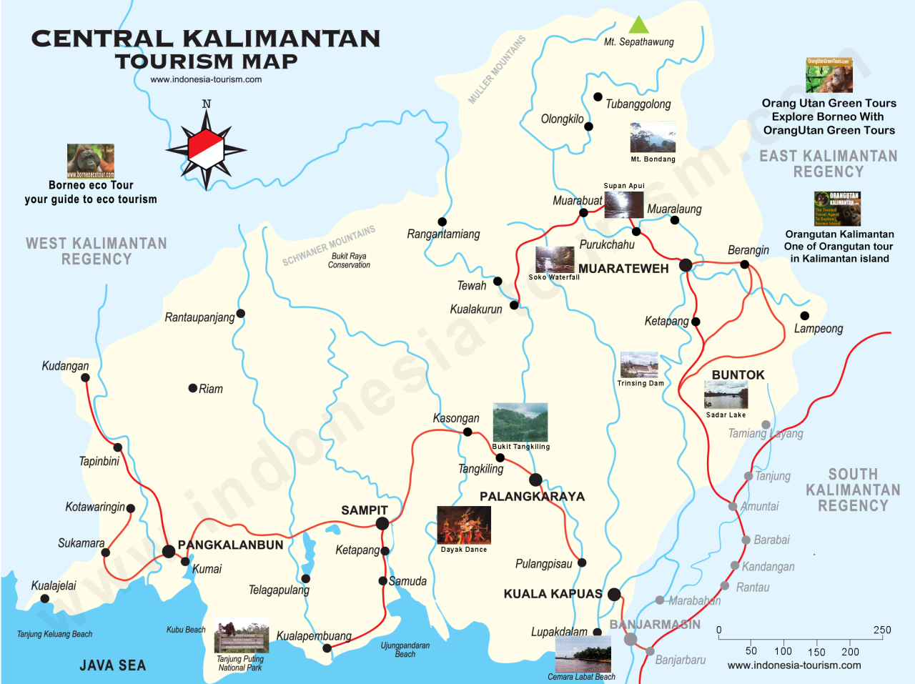 Entry: Garuda Indonedia Airlines domestic flies direct to Palangkaraya, capital of Central Kalimantan, three times every day. Tourism Office: Jl. Tjilik Riwut Km.5, Palangkaraya 73112 Phone. (0536) 3231110 Fax. (0536) 3231007.