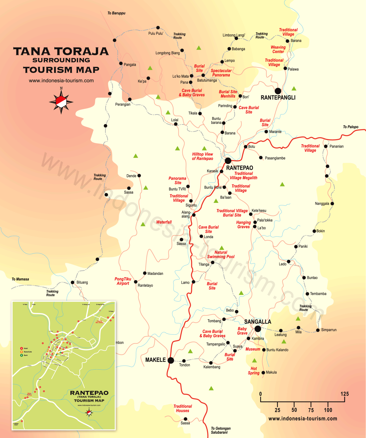 Others include: 1) the one star Misiliana Toraja Hotel at Jalan Jurusan Makale, Rantepao; 2) The Marante Toraja Hotel at Jalan Jurusan Palopo, P.O Box 52, Rantepao; 3) The Marannu Hotel Toraja at Jalan Pongtiku 116-118, Makale, Tana Toraja; 4) The Indra Toraja Hotel at Jalan Landorundun 63, Rantepao