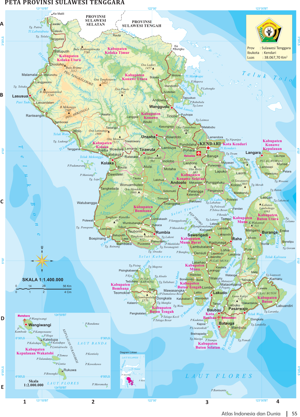 Occupying the lower eastern “petal” of Sulawesi. Southeast Sulawesi Province covers 38,067.70 square kilometers. Its population rose from 2,232,586 in 2010 to 2,417,962 in 2014. Its population density is 63.5 people per square kilometer. Kendari is the capital and main city. Garuda Indonesia Airlines fly directly from Jakarta, Surabaya and Manado to Kendari.