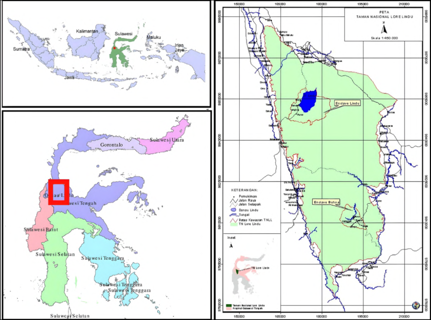 The park’s boundaries are marked by the Palolo Valley in the north, the Napu Valley to the east, and the Bada Valley to the South. The western boundary is defined by a row of narrow valleys, collectively known as the Kulawi Valley. The Pololo, Napu, Lindu and Besoa valleys were once lakes, but are now only partially filled with sediment. Lake Lindu is the only large lake still remaining today. There are 117 villages in and around the park, belonging to the Kaili, Kulavi and Lore ethnic groups.