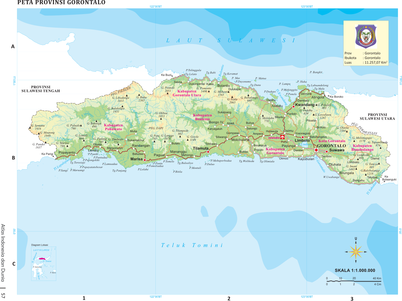 Gorontalo Province is occupied by mountainous areas that stretches form the north to the south of the province. Located on the Minahasa Peninsula in northern Sulawesi west of North Sulawesi Province,, it covers 11,257.07 square kilometers. Its population rose from 1,040,164 in 2010 to 1,134,498 in 2014. Its population density is 92.9 people per square kilometer. The province is divided into five districts and one city. These are Boalemo, Bone Bolango, Gorontalo, Pohuwato, and North Gorontalo, and Gorontalo City, which is also the province’s capital city.