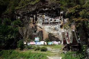Londa (six kilometers north of Rantepao off the main road between Rantepao and Makale) contains hanging graves that belonged to ancient nobles that are filled with effigies to the dead. There are coffins shaped like boats and coffins shaped like pigs. Some of them hang high up on the cliffs. Inside the caves are more coffins as well as skulls and bones. A row of about a dozen and half tat tau are arranged on a terrace. Guides with kerosene lamps can be hired to take you inside the graves to see the skeletons and old coffins.