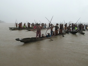 Paul Raffaele wrote in Smithsonian Magazine: “ I ask Kembaren if he is comfortable with the idea of two cannibals accompanying us. "Most of the porters have probably eaten human flesh," he answers with a smile. Kembaren leads me down to the Ndeiram Kabur River, where we board a long, slender pirogue. I settle in the middle, the sides pressing against my body. Two Korowai paddlers stand at the stern, two more at the bow, and we push off, steering close by the riverbank, where the water flow is slowest. Each time the boatmen maneuver the pirogue around a sandbar, the strong current in the middle of the river threatens to tip us over. Paddling upriver is tough, even for the muscular boatmen, and they frequently break into Korowai song timed to the slap of the paddles against the water, a yodeling chant that echoes along the riverbank. [Source: Paul Raffaele, Smithsonian Magazine, September 2006 \=]