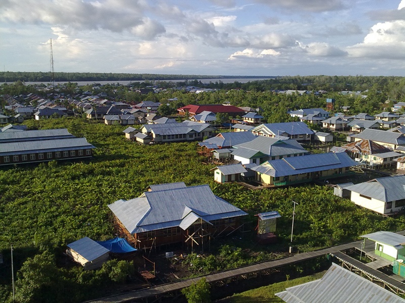 Raised walkways form a network above the muddy ground. The walkways link the village landmarks — churches, mosque, schools, Catholic mission offices, post office, police station and several government offices and a few shops selling basic goods. At high tide, small canoes and outboard motor dugouts weave through a small network of canals.