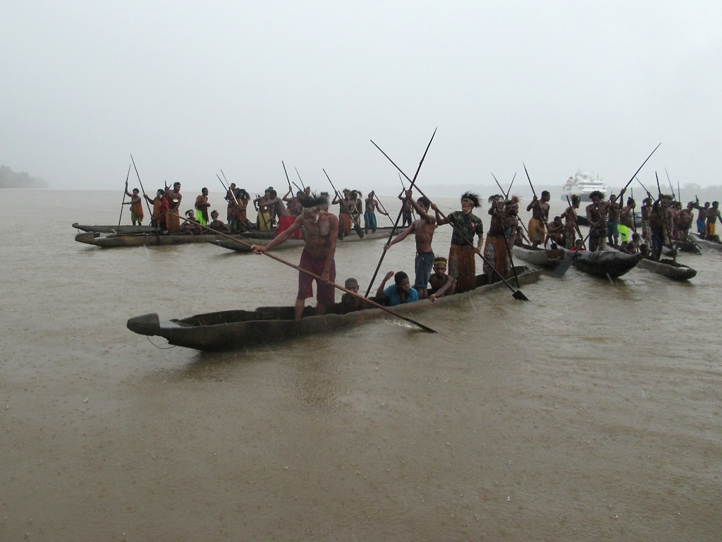“High green curtains of trees woven with tangled streamers of vine shield the jungle. A siren scream of cicadas pierces the air. The day passes in a blur, and night descends quickly. And that's when we are accosted by the screaming men on the riverbank. Kembaren refuses to come to their side of the river. "It's too dangerous," he whispers. Now the two Korowai armed with bows and arrows are paddling a pirogue toward us. I ask Kembaren if he has a gun. He shakes his head no.