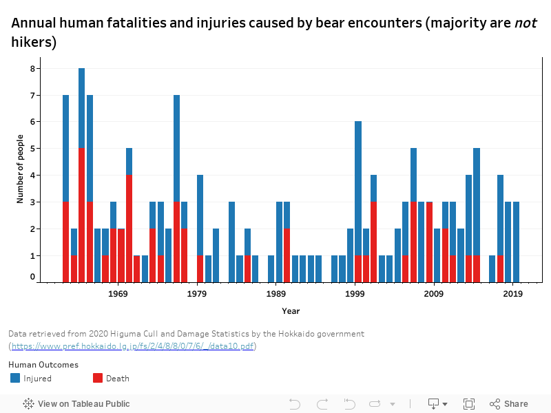 At least 522 people were attacked by bears from 2012 to 2017, with a dozen fatalities, according to Japan’s Ministry of the Environment. Between 2007 and 2017, the ministry said, there have been 880 bear attacks and 24 human fatalities. In 2021 four people were killed in incidents involving bears and 10 were injured — a record number. [Source: AFP, Nathanial Gronewold, E&E News, Politico, July 5, 2018]