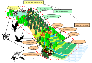 Man-made environments are sometimes almost as rich in wildlife as natural ones. Japan’s rice paddies have their own ecosystems. Dragon flies and frogs , for example, thrive in the paddies and irrigation ditches and provide food for large animals such as birds and fish.