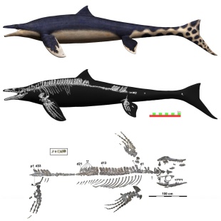 In a study published December 11, 2023 in the Journal of Systematic Palaeontology, scientists in Japan announced the discovery of the near-complete remains of a 72-million-year-old, great-white-shark-size mosasaur along the Aridagawa River in Wakayama Prefecture on Honshu in Japan. Dubbed the "blue dragon" and officially named Megapterygius wakayamaensis, the fossil belonged to a unique species of mosasaur — a group of air-breathing aquatic reptiles and apex marine predators during the Cretaceous period (145 million to 66 million years ago) — with an unusual body plan different enough from other mosasaurs that it was placed in its own genus. The "astounding" remains are the most complete mosasaur fossils ever uncovered in Japan and the northwest Pacific. [Source:Harry Baker, Live Science, December 19, 2023]