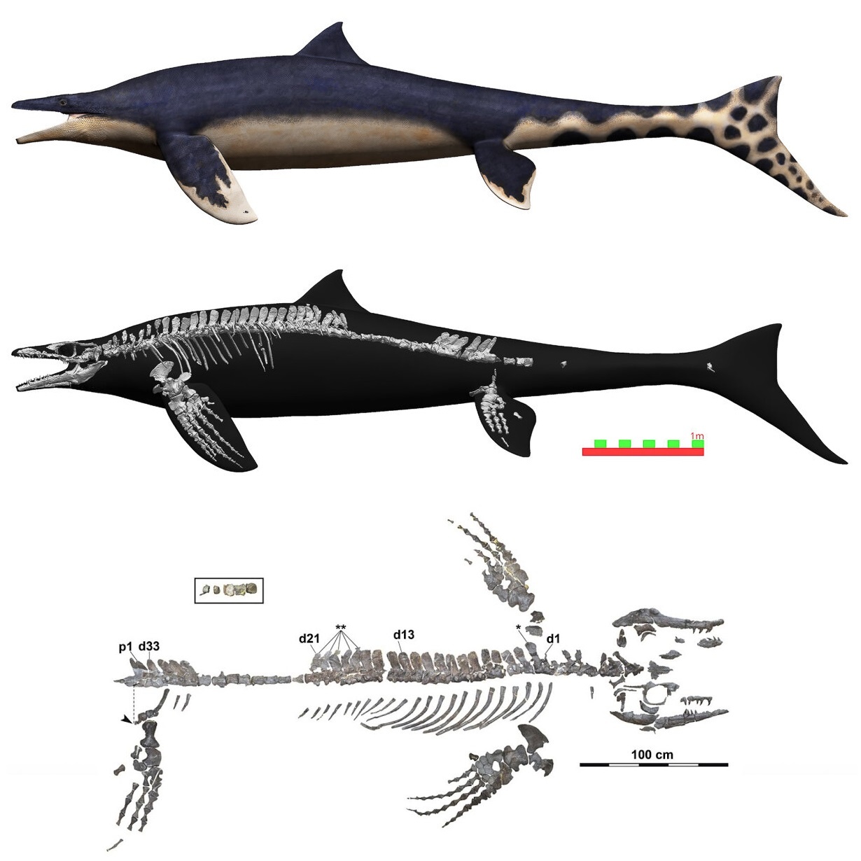 Like other mosasaurs, M. wakayamaensis had a dolphin-like torso with four paddle-like flippers, an alligator-shaped snout and a long tail. But it also had a dorsal fin like a shark or dolphin, which is not seen in any other mosasaur species. However, what confused researchers the most was the size of the new mosasaur's rear flippers, which were even longer than their front flippers. Not only is this a first among mosasaurs but it is also extremely uncommon among all living and extinct aquatic species.