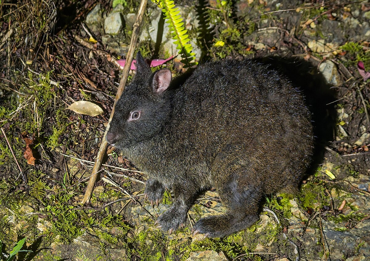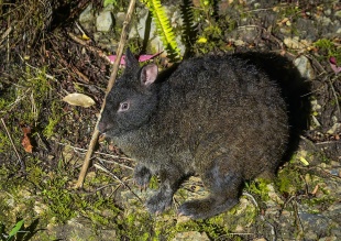 Amami rabbits (Pentalagus furnessi) are found only on two small southern islands, Amami Oshima and nearby Tokunoshima between Kyushu and Okinawa. Primarily nocturnal forest dwellers and also known as Ryukyu rabbits, they are believed to be an ancestral form of rabbit that evolved before its fast-hopping, long-eared cousins. Measuring 39.7 to 53 centimeters (15.6 to 21 inches) from head to rear end, with a two to three centimeter tail and weighing two to 2.9 kilograms (6.4 pounds), they are squat and have a long snout, small ears, tiny eyes that glow red in the dark, and a stout body supported by short legs. The feet are equipped with long, sharp claws used for digging. They feeds on shoots and grasses from spring to autumn and acorns in the short winter.
