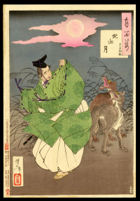 There are many stories about wolves in Japan. A favorite is the “okuri-okami” legend. The okuri-okami is a wolf that follows closely behind people walking along lonely country or mountain roads after dark. You can just barely hear the soft sound of something padding up from behind — but if you stop to listen the padding stops as well. When this occurs you must walk very carefully, because if you happen to trip or fall the wolf will dash up and tear you to pieces. Variations on this folklore theme were widespread throughout Japan. In some versions the wolf is replaced by a huge dog (okuri-inu).