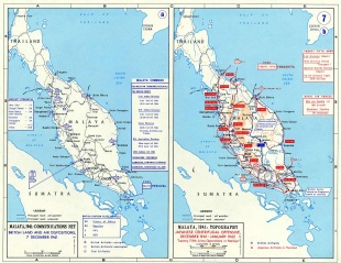 When war broke out in the Pacific in December 1941, the British in Malaya were completely unprepared. Although they had built a major naval base at Singapore during the 1930s in anticipation of the growing threat of Japanese naval power, they had never anticipated an invasion of Malaya from the north. Due to the demands of the war in Europe, virtually no British air capacity remained in the Far East. Thus, the Japanese were able to attack from their bases in French Indochina with impunity. Despite stubborn resistance from British, Australian, and Indian forces, the Japanese overran Malaya in two months. With no landward defenses, air cover, or water supply, Singapore was forced to surrender in February 1942, which did irreparable damage to British prestige. British North Borneo and Brunei were also occupied. [Source: Wikipedia]