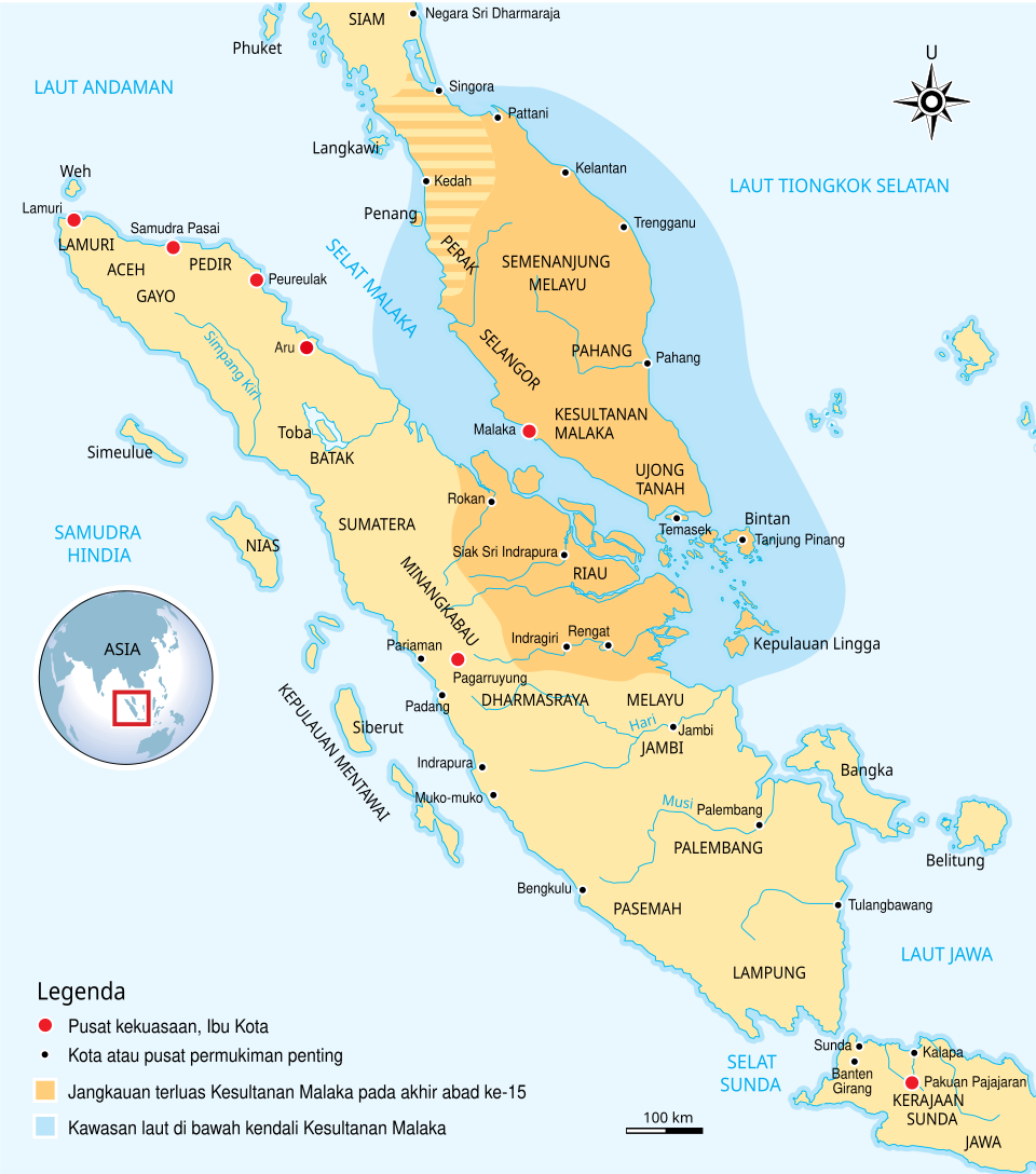 By the late fourteenth century, Malacca had become an important commercial power and cultural influence along the Strait of Malacca, largely as a result of its numerous advantages as a trading port and its commercial and military alliances with China and the Malay kingdom of Bintan, an island near Singapore and home of the Orang Laut. When Muzaffar Shah became Malacca’s ruler in 1444, he declared the kingdom a Muslim state, and Malacca’s growing commercial, military, and political influence helped spread the Islamic faith throughout the region.
