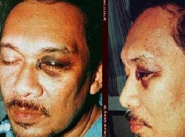 Shortly after he was arrested, Anwar showed up at court with a black eye and bruises. This caught the attention of the international media and all of a sudden the Anwar story was front page news. Anwar said that he was arrested by police in ski masks who broke into his home and handcuffed and blindfolded him and taken to a police station, where he was beaten until he fell unconscious. Anwar sustained a serious back injury during the beating and showed up at court in neck brace. In February, police chief Abdul Rahim Noor admitted punching and slapping Anwar during questioning.