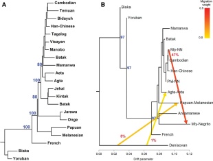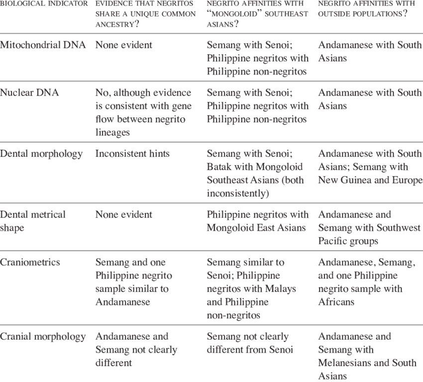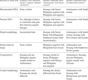 Negritos are of an unknown origin. Some anthropologists believe they are descendants of wandering people that "formed an ancient human bridge between Africa and Australia.” Genetic evidence indicates they much more similar to the people around them than had been previously thought. This suggests that Negritos and Asians had the same ancestors but that Negritos developed feature similar to Africans independently or that Asians were much darker and developed lighter skin and Asian features, or both. [Source: Kirk Endicott, “Encyclopedia of World Cultures Volume 5: East / Southeast Asia:” edited by Paul Hockings, 1993 ~]