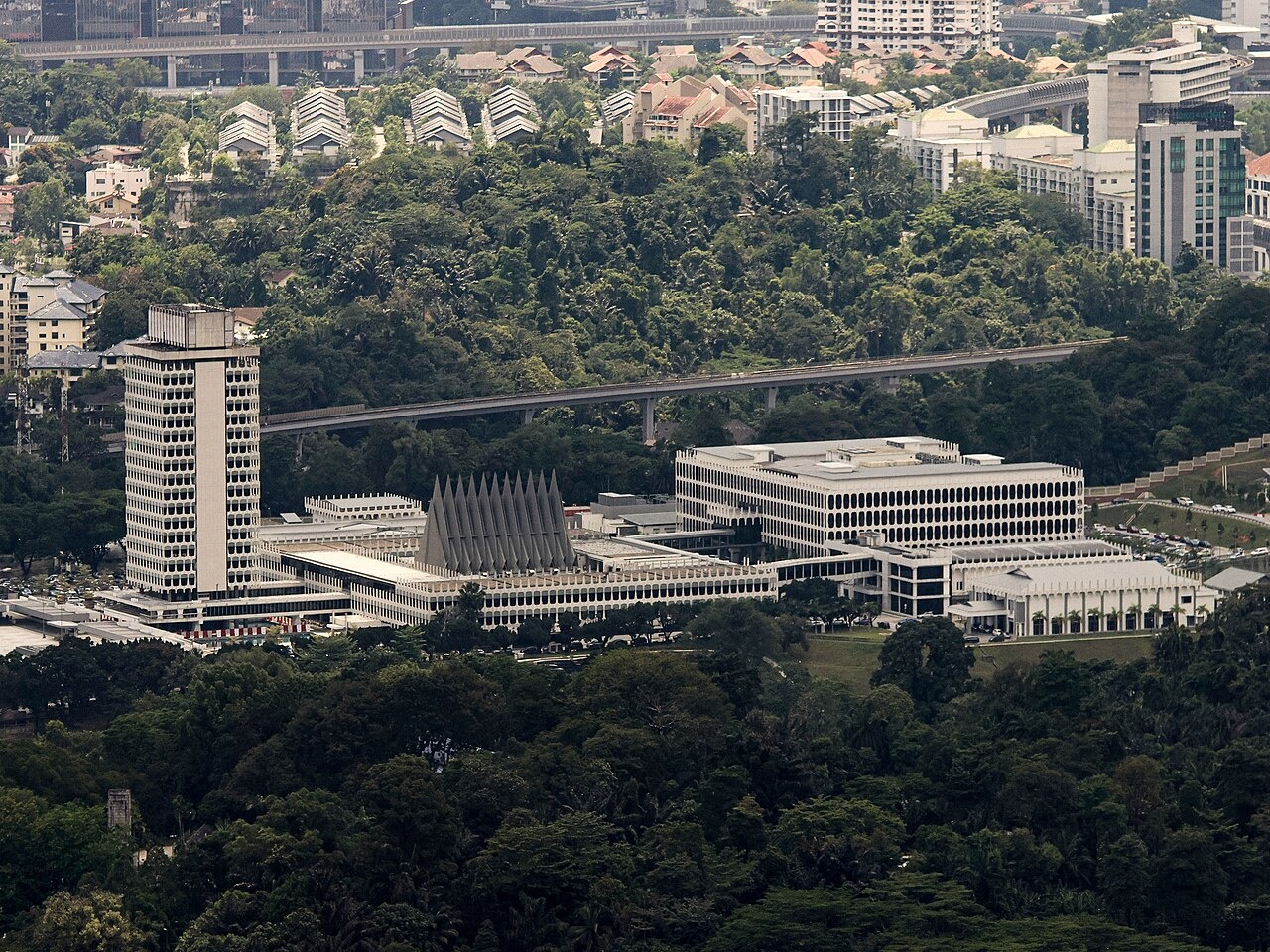 The Malaysian Houses of Parliament (Malay: Bangunan Parlimen Malaysia) is the complex where Parliament meets. Located near the Perdana Botanical Gardens and close to the National Monument, the complex consists of a three-story main building and a 17-story tower rising about 77 meters. The main building contains the Dewan Rakyat (House of Representatives) and the Dewan Negara (Senate), while the tower houses offices for members of Parliament.