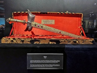 Keris Panjang Diraja (Royal Long Keris): is the most important symbol of royal authority and is worn during installation ceremonies. Its hilt and sheath are covered in gold, and its blade was forged from steel taken from keris from the eleven states. The crosspiece bears the crests of the Federal Government and the eleven states. The hilt resembles a horse’s hoof decorated with jering fruit motifs. It is worn only by the Yang di-Pertuan Agong on special occasions.