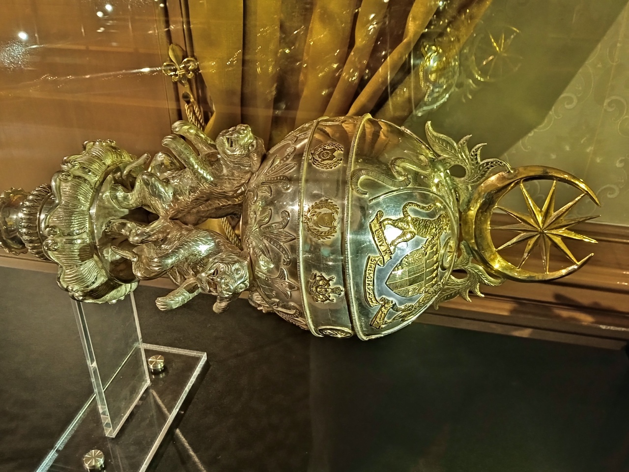 Cogan Alam (Sceptre of the World) symbolizes royal authority. Made of silver, it is topped with an orb crowned by a gold crescent and star. The orb bears the crests of the eleven states and is supported by tiger figures, while the shaft is decorated with golden paddy ears.