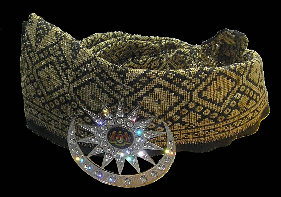 Tengkolok Diraja (Royal Headdress): For centuries, Malay Rulers have worn a folded silk headdress as part of their royal regalia. The folding style, known as solek, varies by state and includes designs such as Anak Gajah Menyusu, Lang Menyusur Angin, and Dendam Tak Sudah. During the installation ceremony, the Yang di-Pertuan Agong wears a black, gold-embroidered tengkolok folded in the Dendam Tak Sudah style from Negeri Sembilan. It is adorned with a crescent and star bearing the Malaysian national crest. [Source: malaysianmonarchy.org ]