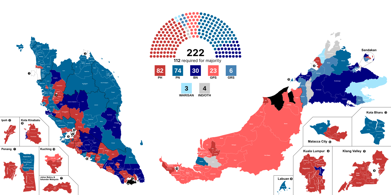 The Results announced on November 20 showed a hung parliament—the first in Malaysia’s history. Pakatan Harapan won the most seats but with reduced support, while Perikatan Nasional dominated the northern and east coast states in what became known as the “Green Wave.” The long-dominant Barisan Nasional fell to third place, and several prominent politicians, including former prime minister Mahathir Mohamad, lost their seats. After securing backing from Barisan Nasional, Gabungan Parti Sarawak, and other parties and independents, Pakatan Harapan leader Anwar Ibrahim was appointed prime minister and sworn in on 24 November 2022. Perikatan Nasional became the official opposition.