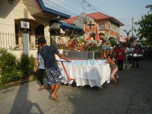 “A pledge. Philippine fiestas are like capital poured into investments. They have to be celebrated grandly to ensure good life ahead. The bigger money poured out for a Philippine fiesta the surer the return of investment (ROI). So, for a higher ROI a devotee should spend more to celebrate a fiesta. Smaller investments result to smaller yields. If one wishes for more harvests from fields or the sea, or more luck in business or employment, or physical healing, or more rain, then one ought to dole out more quality meals in a fiesta celebration. If one’s really financially hard-up, then the alternative is to have active parts in the celebration—dance in the streets, help carry or pull a mounted statue, help in the fiesta preparations, or plain behave well throughout the celebration. And here’s the key to all these: the devotee has to pledge or promise to keep this going each annual Philippine fiesta.” +