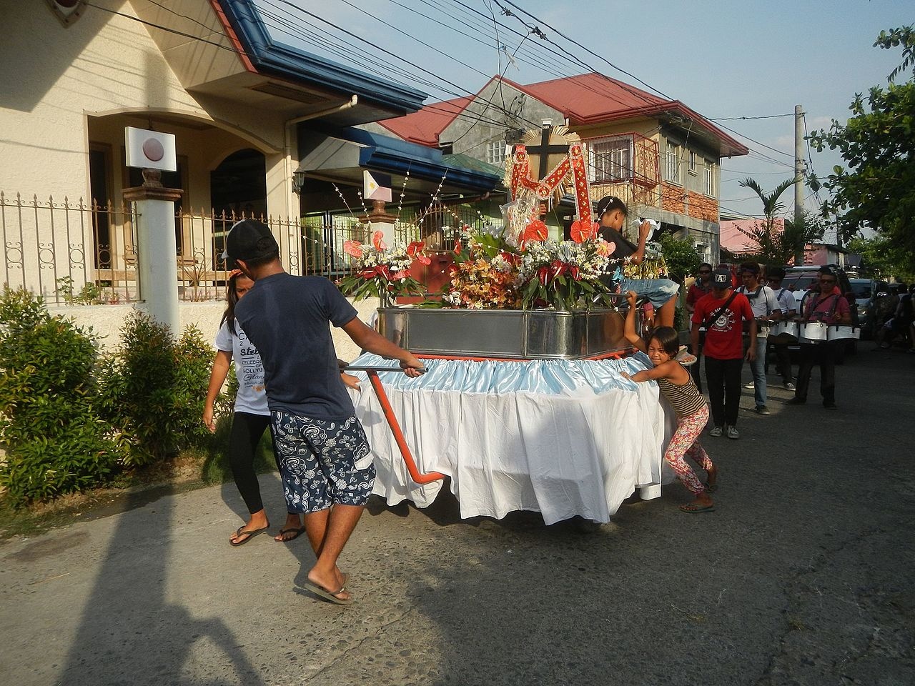 In towns located along rivers or the coast, the highlight of the fiesta is often a fluvial procession, in which the image of the patron saint is carried across the water. The image is typically placed inside a bamboo structure known as a pagoda, mounted on a decorated barge and accompanied by other boats filled with devotees. In the town of Angono, for example, the waterborne procession is followed by a lively land procession through the main streets, where participants and spectators cheerfully splash one another with water. In inland communities, the procession usually begins at the parish church and winds through the principal streets before returning to the church. Devotees walk alongside the saint’s image—mounted on a wheeled platform known as a carroza—while holding candles and offering prayers.