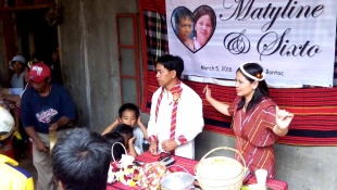 The Bontoc wedding ritual usually spans several days. It starts with the delivery of the faratong (black beans) from the girl to the bachelor signifying the bride’s intentions to marry. Afterwards, the bride’s family sends out what is known as the khakhu (salted pork) to the groom’s family. This is countered by the sending of sapa (glutinous rice). These food items are distributed to their respective family members, including their relatives. An important rite called insukatan nan makan (exchange of food) follows. Here, one of the groom’s parents, after receiving an invitation, must go to the bride’s house and have breakfast with them. Later, the groom’s parents also invite a bride’s parent for a similar meal. The next step is the farey. The bride and a kaulog (girlfriend) will visit the house of the groom. This is when they ‘start entering each other’s houses’. They will have to leave immediately also, but they will be invited again on the following morning for breakfast. This is the start of the tongor (to align). [Source: kasal.com ^]