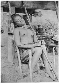 “But these formal dances were not the only ones. Everybody danced, even Cootes and I again; but it was our last time. People kept on arriving from miles around, columns in single file, headed by men bearing bubud-jars on their heads. Every party, of course, brought its gansas, and had to give an exhibition of dancing on the parade. In general, but few parties were armed; and, as elsewhere, there were no old women. Some of the shyer people, coming from afar, had brought their spears, and, squatted on the slopes round about, apparently passed their time in silent contemplation of the great game going on below. Everybody seemed to be in a good humor.