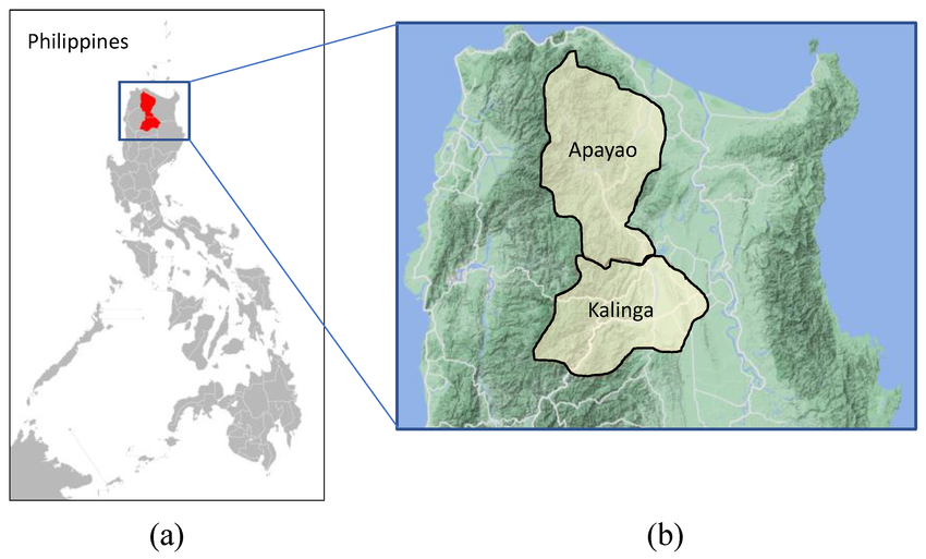 Kalinga Province is located in Cordillera region — a mountainous area in north-central Luzon. Kalinga territory encompasses the floodplains of Tabuk and Rizal as well as the Chico River. The region is rich in natural resources, with gold and copper deposits particularly common in Pasil and Balbalan. Tabuk was settled as early as the 12th century, and from there Kalinga communities spread throughout the area, practising both wet-rice cultivation (papayaw) and swidden farming (uwa).