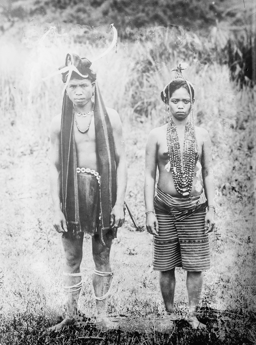 Members of the kadangyan (wealthy elite) signal their status through clothing and adornments reserved for their class. Elite men wear an ornate G-string, a tasseled hip bag, kidney-shaped gold earrings, and an elaborate headdress composed of a turban-like cloth, a hornbill skull, and water buffalo horns. Elite women wear finely made skirts, tasseled belts, gold earrings, four strands of bead necklaces, white and red bead strings to secure their long hair, and a small brass statuette.