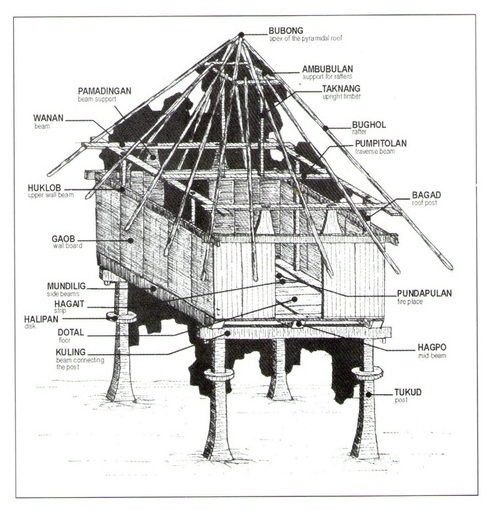 Houses vary in size according to the wealth of the owner. They are well-built wooden structures made to last for generations. They have few furnishings or decorations, except for the occasional carved human figure on the doors and, formerly, a shelf for displaying the skulls of enemies and sacrificial animals. Larger communities have stone platforms at their centers where communal celebrations are held and prestigious houses are built. Less permanent structures, such as agamang dormitories for girls and unmarried women, are built on the ground. ~