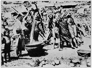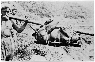 It was a month of feasting and holidays. Carabaos, hogs, dogs, and chickens were killed and eaten. No work except that absolutely necessary was performed, but all people—men, women, and children—gathered at the ato dance grounds and were joyous together. Each ato brought a score of loads of unhusked rice, and for two days women threshed it out in a long wooden trough for all to eat in a great feast. Twenty-four persons, usually all women, lined up along each side of the trough, and, accompanying their own songs by rhythmic beating of their pestles on the planks strung along the sides of the trough, each row of happy toilers alternately swung in and out, toward and from the trough, its long heavy pestles rising and falling with the regular “click, click, thush; click, click, thush!” as they fell rebounding on the plank, and were then raised and thrust into the unhusked rice-filled trough.