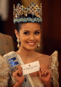 In September 2013, Miss Philippines, Megan Young, won the Miss World contest in a glittering finale on the Indonesian resort island of Bali “I promise to be the best Miss World ever,” Young, 23, said after winning the 63rd annual event, as a large number of Filipino fans who traveled with her celebrated by jumping and waving the country’s flag. “Salamat sa mga kababayan ko. Mahal na mahal ko kayo (Thanks to my compatriots. I love you very much),” said the teary-eyed actress after she was crowned at the end of a three-week contest [Source: Associated Press, Inquirer.net, September 28, 2013].