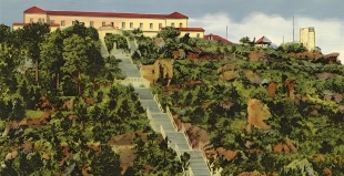 The bell tower complements the overall composition, serving as a visual counterpoint to the convent on the opposite side. Its design incorporates alternating window forms and culminates in decorative pinnacles, a balustrade, and a dome influenced by Islamic architecture. Throughout the structure, the natural stone finish is preserved, emphasizing simplicity and refinement. Clean lines, restrained ornamentation, and a balanced composition give the church a sense of calm dignity and timeless elegance.