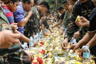 Lunch is traditionally the main meal of the day, and even today, in busy cities, it can still be an elaborate affair with several courses-or it can be a simple noodle dish or fast food bolted down in a matter of minutes. Lunch can also be a light meal with rice and one other dish, often a fish or meat stew. Lunch is served from about 12:00noon to 1:00pm and consists sour soup, cooked pork, meat stew, fish, and/or vegetables, served with rice and fruit or cakes. Many dishes can be steamed, stir-fried, or boiled in a variety of different ways, either simply or more elaborately. Lechon, or pork, is usually roasted or barbecued, and is a very popular meat. You will see adobo, a spice, just about everywhere. Fish sauce and fish paste are available with most ethnic Philippine foods, and have very pungent flavors: start out carefully. Filipinos enjoy sweet pastries, so a very sweet dessert of fruits, pudding, or cake is usually available for every meal. Typically, the drinks served with lunch and dinner are soft drinks, beer, and/or tea or coffee. /=/