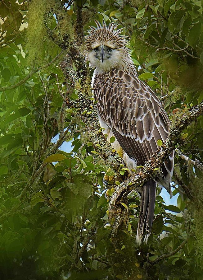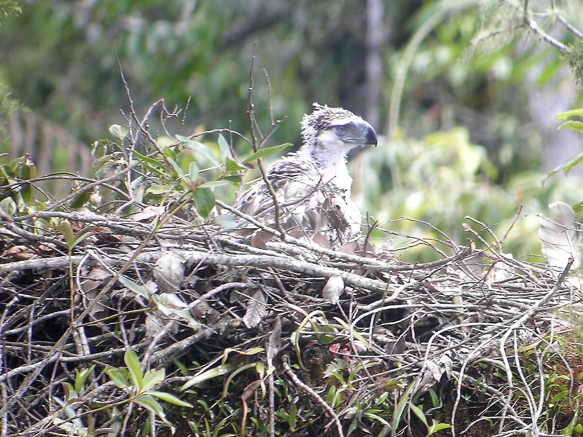 The great birds of prey of the rain forest — the Harpy eagle, the crowned eagle of Africa and the Philippine eagle — are remarkably similar. All have large crests, and broad relatively short wings with long tails, which allow them to maneuver through the trees. They build a large, platform nest of twigs which they reuse season after season and usually raise a single offspring that stays with the parents for about a year. One unique feature of the Philippine eagle is its blue eyes, a rarity among raptors. Both sexes raise their crests. Their large size is due in part to they fact they evolved without competition from big cats and other large predators.