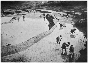 Albert Ernest Jenks wrote: In the Banaue district, there are terrace walls certainly 75 feet in height, though many of these are not stoned, since the earth is of such a nature that it does not readily crumble...Turning the soil for the annual crop of irrigated rice begins in the middle of December and continues nearly two months. The labor of turning and fertilizing the soil and transplanting the young rice is all in progress at the same time—generally, too, in the same rice terrace. Before the soil is turned in a rice terrace it has given up its annual crop of camotes, and the water has been turned on to soften the earth. From two to twenty adults gather in a sementera, depending on the size of the field. [Source: “Bontoc Igorot” by Albert Ernest Jenks, 1905]