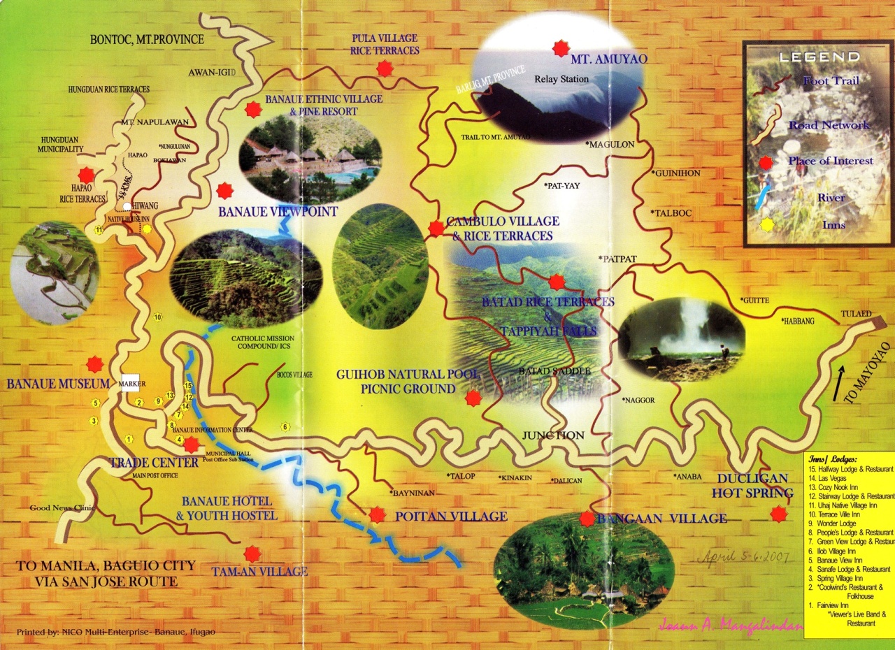 Ifugao Province (322 kilometers north of Manila) is where Banaue, Batad and many of the famous rice terraces are located. The province is a land-locked area located at the foot of the Cordillera Mountain Range, bounded on the west by the province of Benguet, Nueva Viscaya on the south, Isabela on the east, and on the north by Mountain Province.