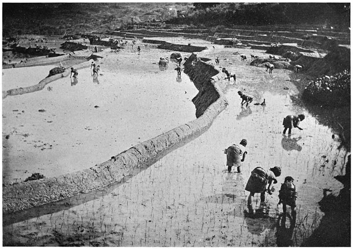 The rice terrace is about 20 by 50 feet, or about 1,000 square feet, and lies in the midst of the large valley area between Bontoc and Samoki. It is on the Samoki side of the river, but is the property of a Bontoc family. There are two groups of soil turners in the rice terrace—three men in one, and two unmarried women, an older married woman, and a youth in the other. At one end of the plat two, and part of the time three, women are transplanting rice. Four men are bringing fertilizer for the soil.
