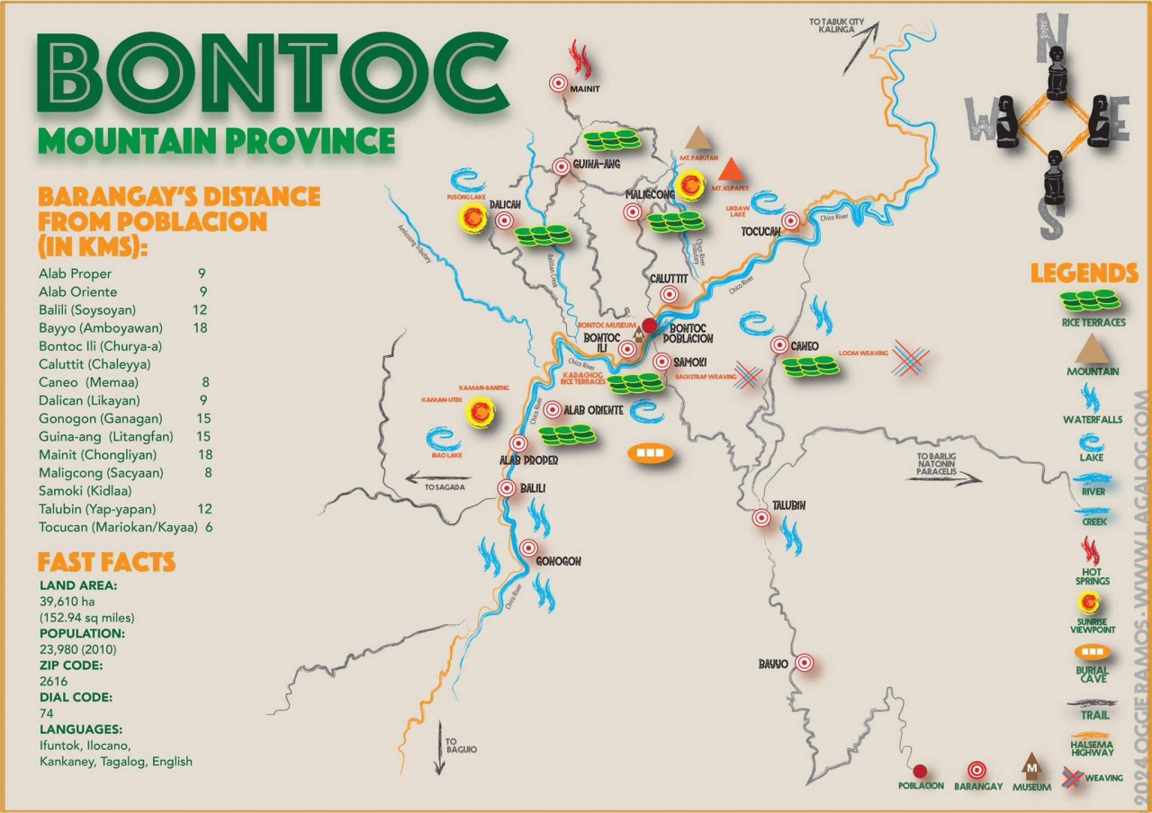 Mountain Province is composed of ten municipalities: Bontoc, Barlig, Bauko, Besao, Natonin, Paracelis, Sabangan, Sadanga, Sagada, and Tadian, with Bontoc as the capital town. There are 144 barangays comprising the 10 municipalities. The province is only home to about 160,000 people and has 72 people per square kilometer, making it one least densely populated provinces in the Philippines. Kankanaey is the major language-dialect spoken. English, Ilocano and Tagalog are also widely spoken.